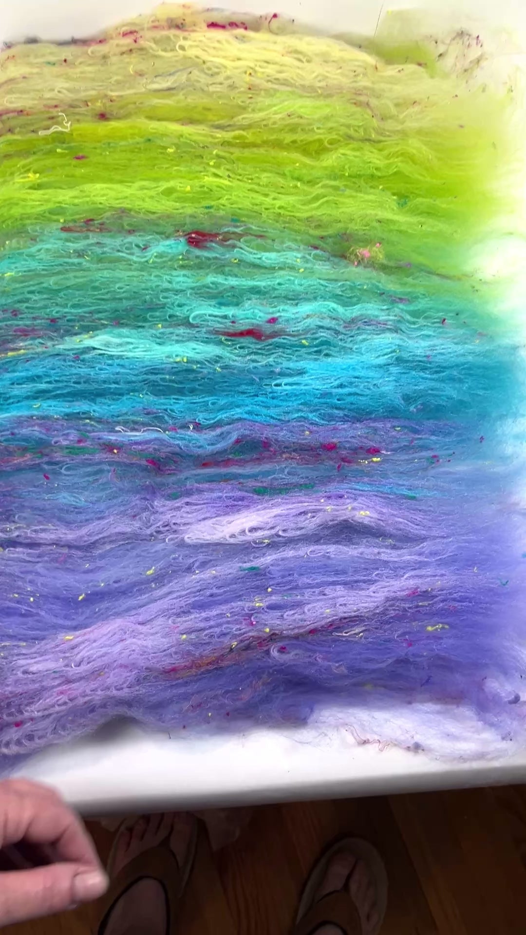 Falkland Merino wool with 2 layers of goodies- silk and silk noils. NO sparkle. Not exactly repeatable.