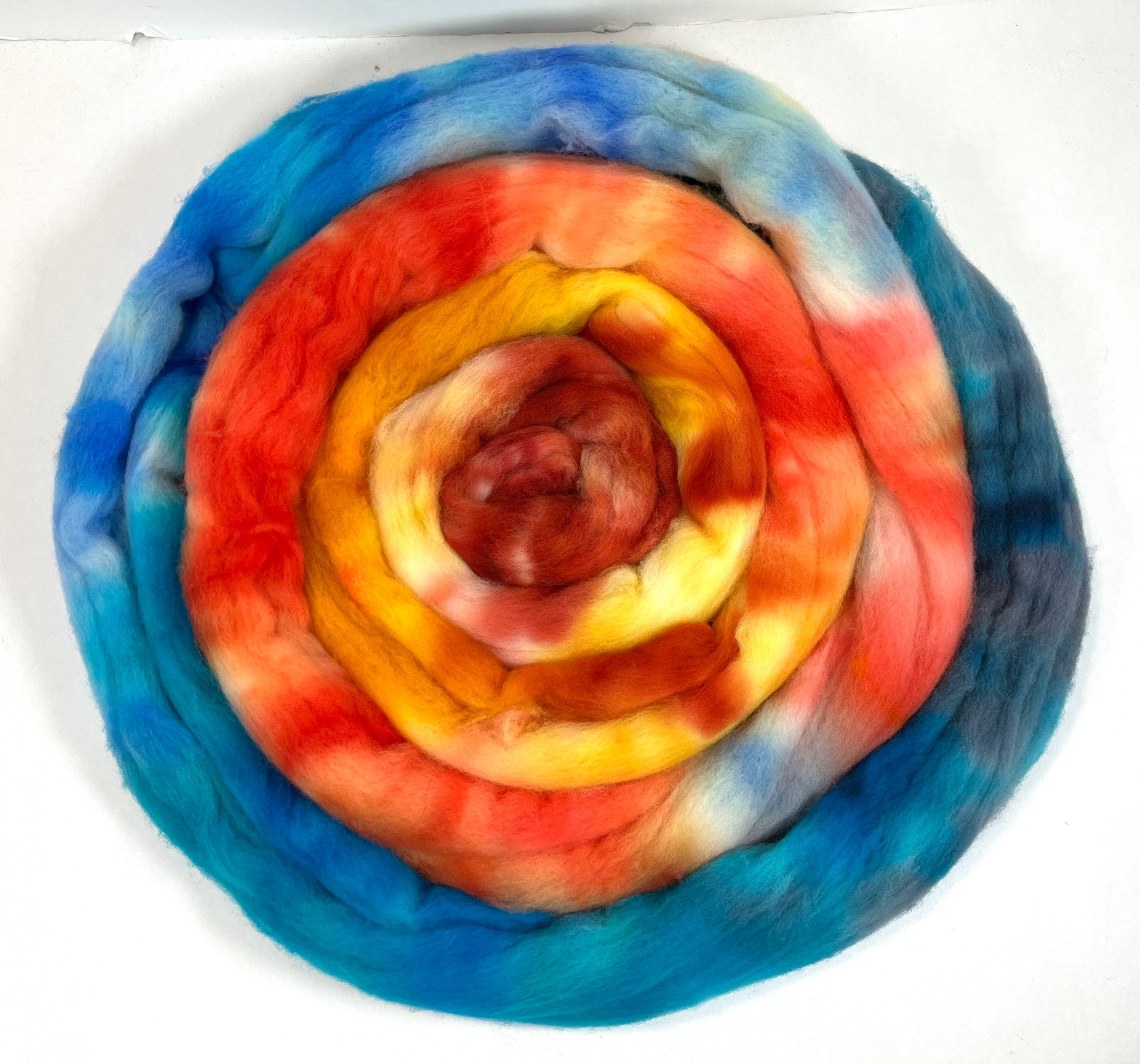 4 oz Targhee wool combed top. Product of USA beginning to end. This colorway was produced with no measuring, I just had FUN putting blues, yellows and oranges together. It’s so energetic, it will spin up in any style into a stunning yarn. This colorway is unique and not repeatable.