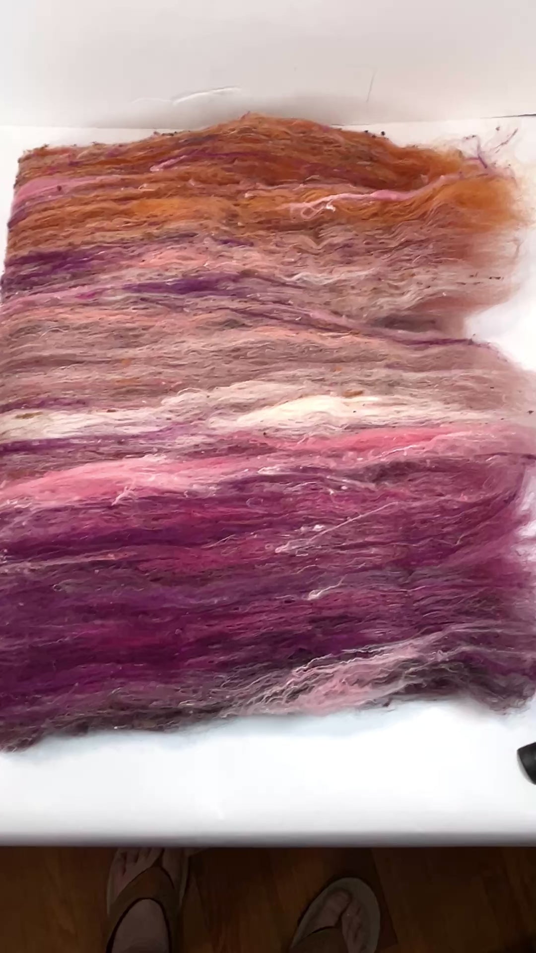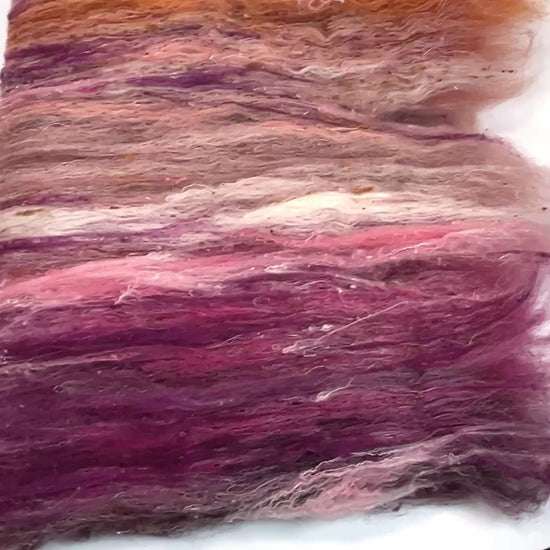 This batt is lightly textured, with hemp added for body, and short silk laps for color and texture. Everything in it is soft and skin friendly, and it will draft easily.